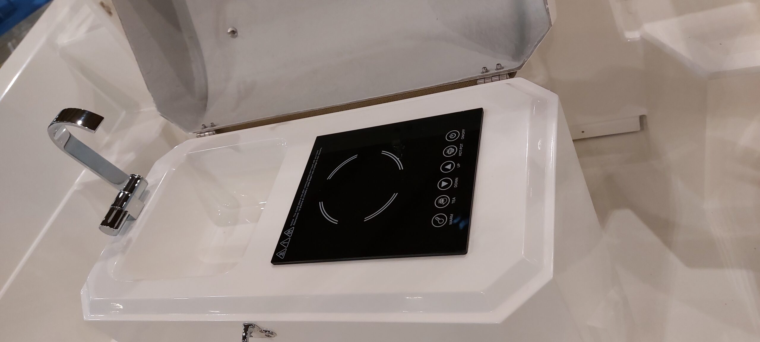 Sotto la seduta di guida è presente di serie un lavello con a fianco lo spazio per un fuoco o un piano ad induzione.