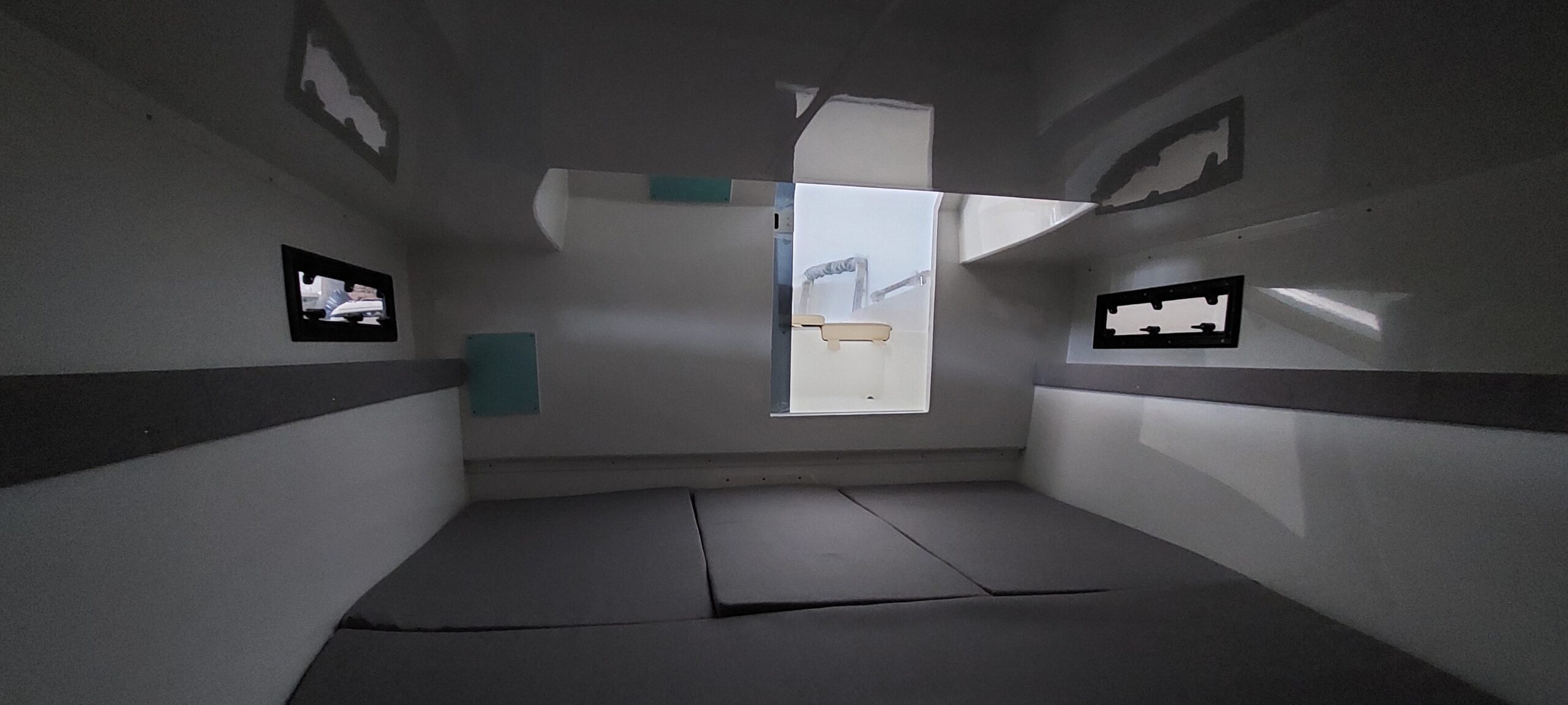 La parte interessante si sviluppa nel sottocoperta con cabina ampia ed estremamente accogliente e comoda per 2 persone. Completamente coibentata da uno spessore di isolante termico, garantisce uno spazio fruibile anche nelle giornate più calde. (Ricircolo dell’aria garantito da due ampi oblò laterali). Due ampi gavoni situati nel pozzetto.